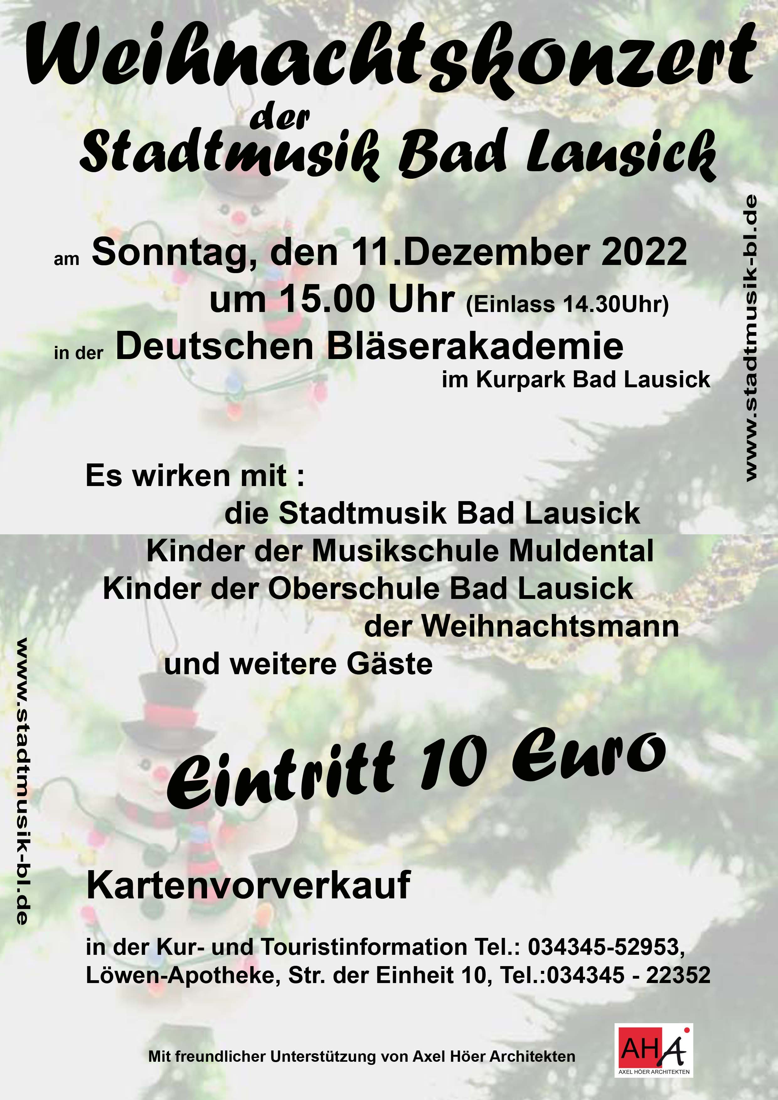 Karten sind zum Preis von 10€ an den bekannten Vorverkaufsstellen Löwenapotheke und Kur- und Tourist-Information Bad Lausick sowie an der Tageskasse erhältlich.