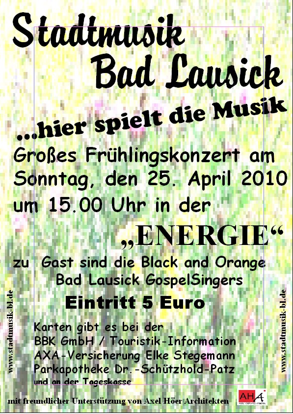 Frühlingskonzert 2010 - was war das für ein Jahresauftakt. Fast fünf Monate sind seit dem letzten Konzert vergangen und die Zeit wurde gut genutzt. Neue Titel wurden einstudiert (Säbeltanz, Dschingis-Chan-Medley, Bridge over trouble Water u.a.) und ältere Titel neu aufpoliert. Wenn auch nur 84 zahlende Gäste anwesend waren so haben sie doch eine Stadtmusik erlebt, die mit viel Freude uhd Herz mal laute aber auch leise Töne zu Gehör brachten. Mit von der Partie waren wieder die Black&Orange Bad Lausick Gospel Singers, die mit ihrer ganz eigenen Art bekannte Gospeltitel singen aber auch andere Titel im Gospelsound interpretieren. Herzlichen Dank an allle Mitwirkenden und an das Team der Gastgeber der Ev. Freik. Gemeinde Bad Lausick.