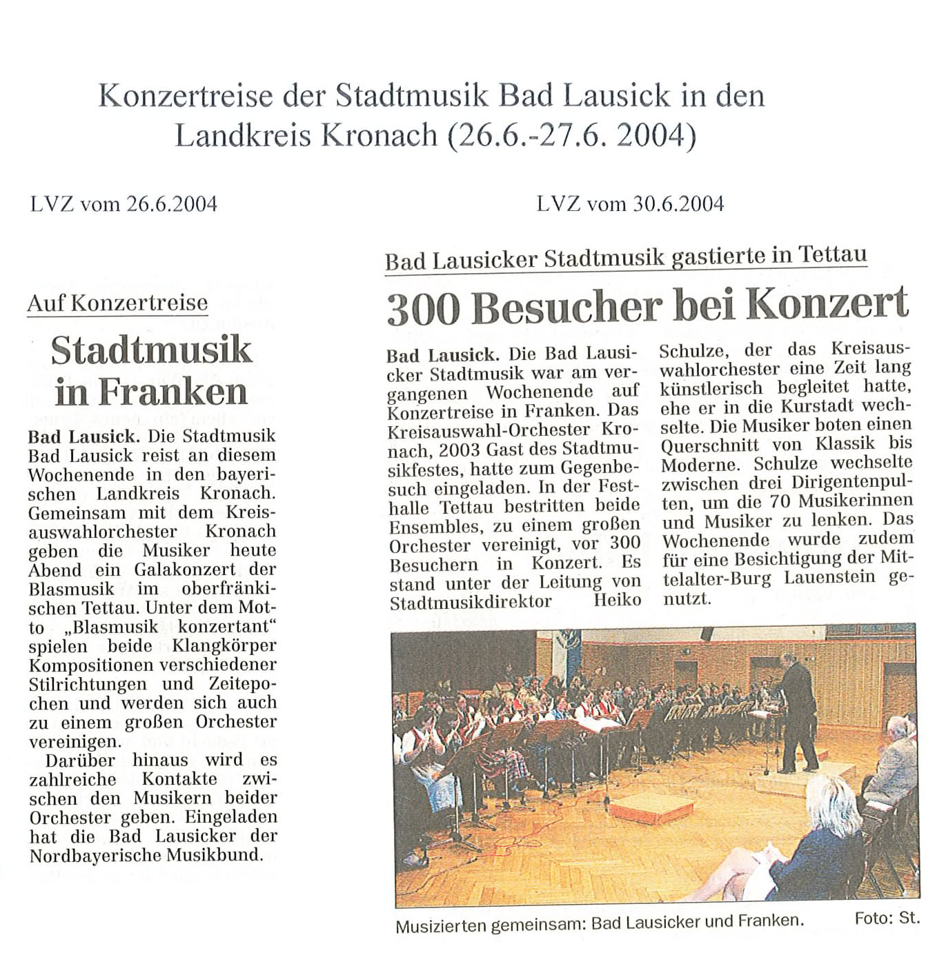 Die Stadtmusik Bad Lausick reiste auf Einladung des Nordbayrischen Musikbundes im Juni 2004 nach Kronach. Sie kam damit zu einem Gegenbesuch zum Kreisauswahlorchester Kronach, welches 2003 zu Gast zum Stadtmusikfest war.