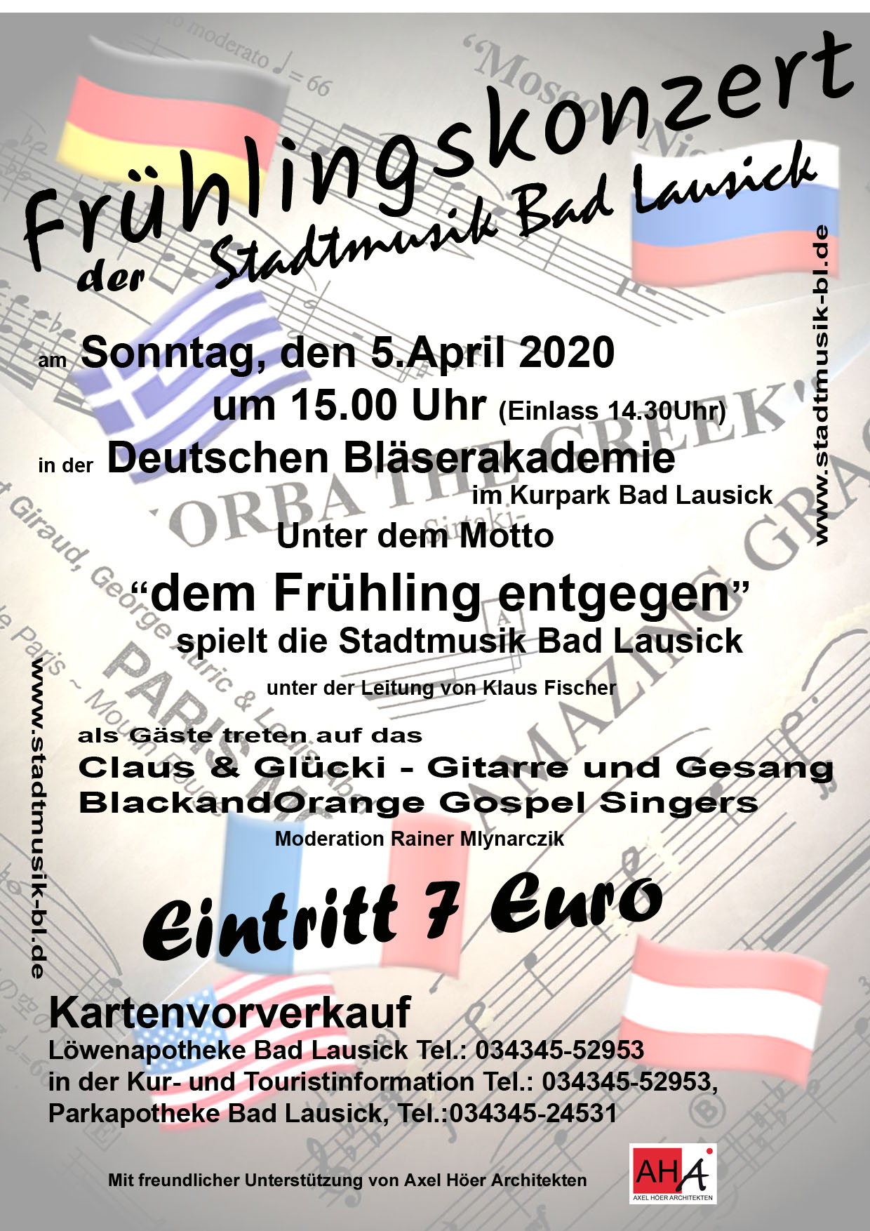 Die Stadtmusik Bad Lausick lädt unter dem Motto "dem Frühling entgegen" am Sonntag, den 5. April 2020 um 15.00 in den Saal der Deutschen Bläserakademie zum Konzert ein. Karten gibt es bereits im Vorverkauf an den bekannten Verkaufsstellen.